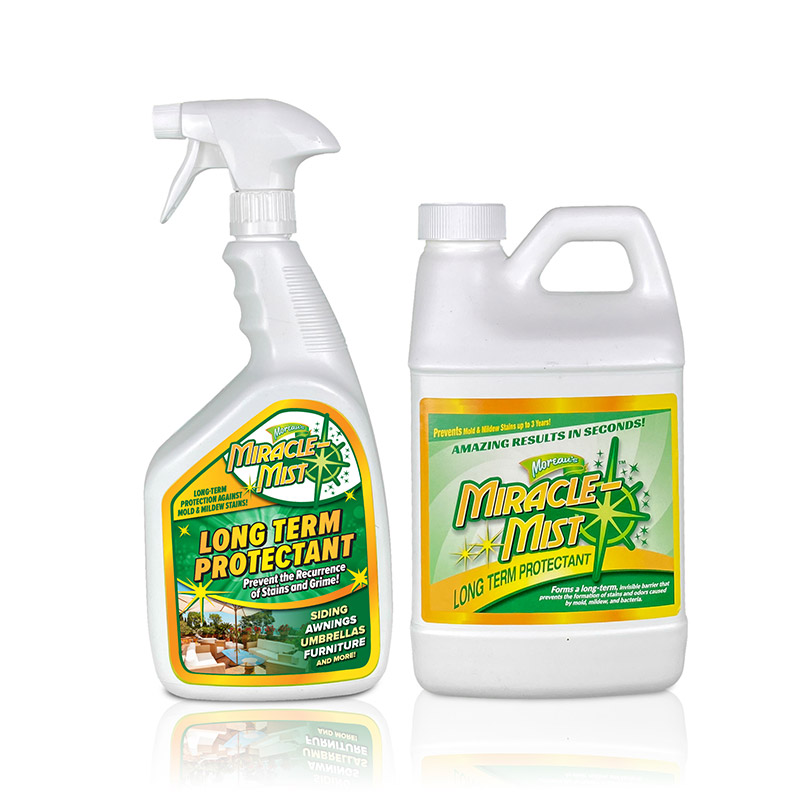 MiracleMist Long-term Protectant (LTP) is the answer for preventing the recurrence of mold, mildew, and algae stains. Works on any surface. Following label instructions, spray or fog LTP onto cushions, fabrics, awnings, siding, decks, concrete, etc. and allow to dry. It’s literally that easy to keep your home, boat, and RV free from mold, mildew, and algae stains.